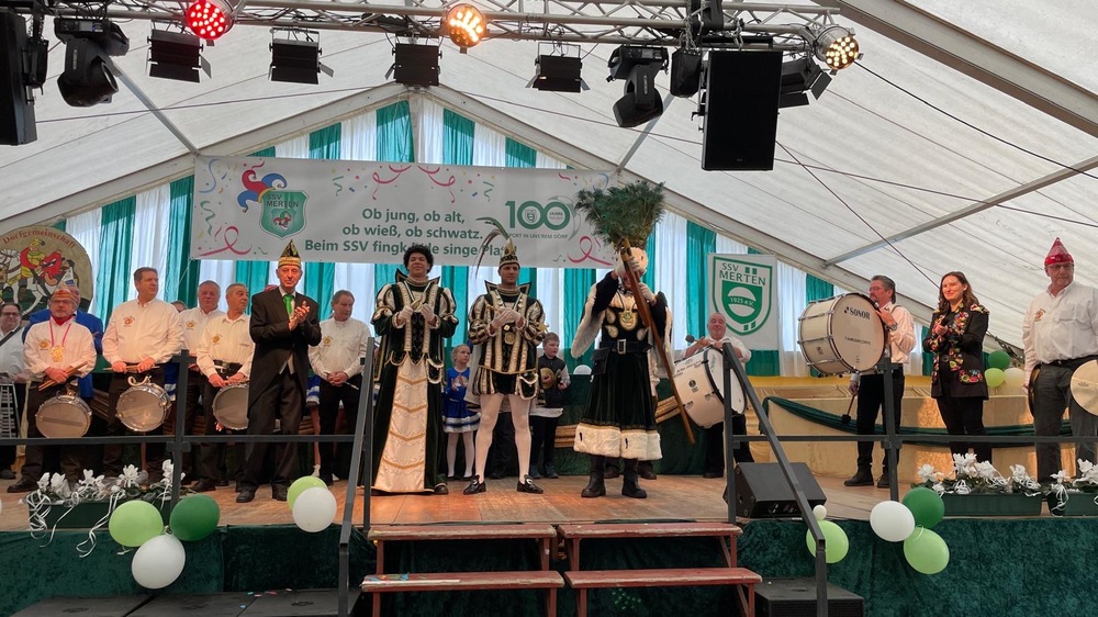 Bekanntlich stellte der SSV Merten aus Anlass seines 100-jährigen Jubiläums das Mertener Dreigestirn der Session 2025. Prinz Jerome I. (Jerome Propheter), Bauer Gaspard (Gaspard Fehlinger) und Jungfrau Elli (Eliot Albert) wurden am Samstag, 11.01.2025 festlich proklamiert. Im voll besetzten Festzelt in Merten stand alles im Zeichen von "grün und weiß". Das Mertener Publikum bereitete den Dreien einen begeisterten Empfang und die gaben in Top-Form reichlich zurück. Die Stimmung war vor dem Überlaufen. Auch beeindruckend das Bild vom Elf(meter)rat, wobei man von Rätinnen sprechen muss; denn das Damenteam stellte dieses Gremium. Und als Adjutanten und Gefolge waren viele Mannschaftskollegen aus der 1. Mannschaft dabei.
