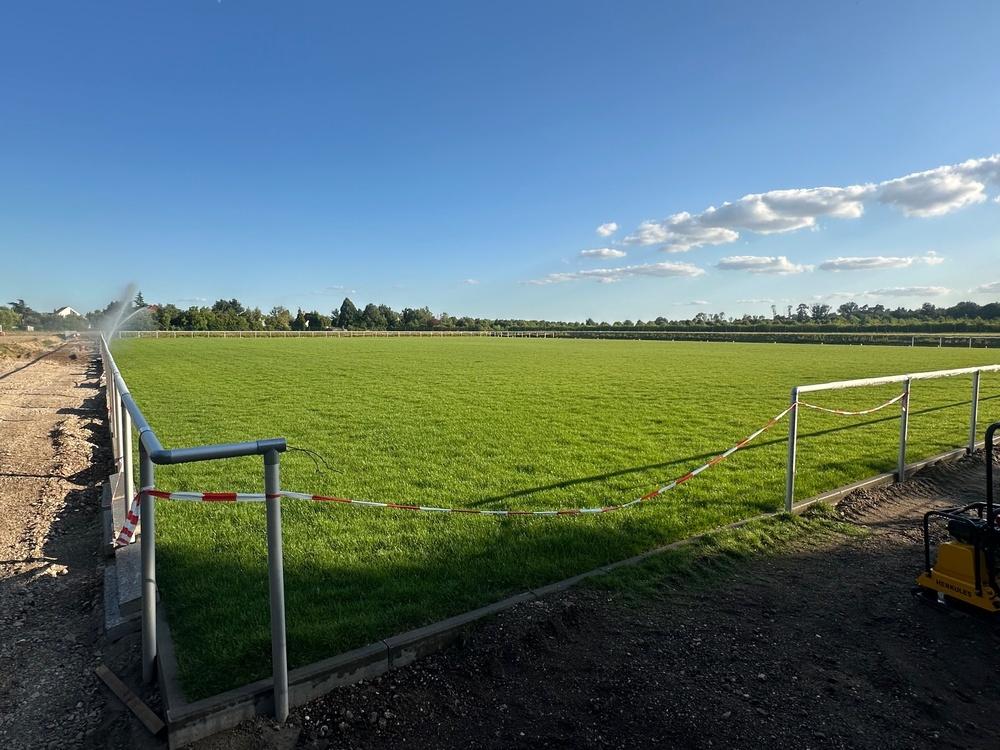 Unser stolzes „neues Wohnzimmer“, der neue Naturrasenplatz, geht in seiner Grundstruktur der Vollendung entgegen. Der erst vor wenigen Wochen eingesäte Rasen gedeiht und ähnelt einem grünen Teppich; bei der Trockenheit musste zuletzt allerdings mit einer Berieselung „Hilfestellung“ geleistet werden.